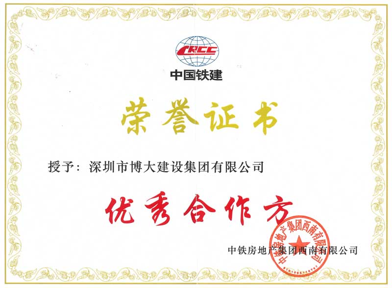 博大建設集團作為中國鐵建的長期合作伙伴,已連續數年榮獲“優秀合作方”稱號。