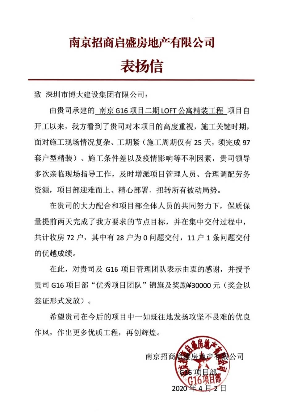 博大建設集團在南京G16項目二期LOFT公寓精裝工程中,迎難而上,積極解決工期問題,以高標準的質量,提前完成節點目標,受到客戶的表揚,并榮獲“優秀項目團隊”榮譽。