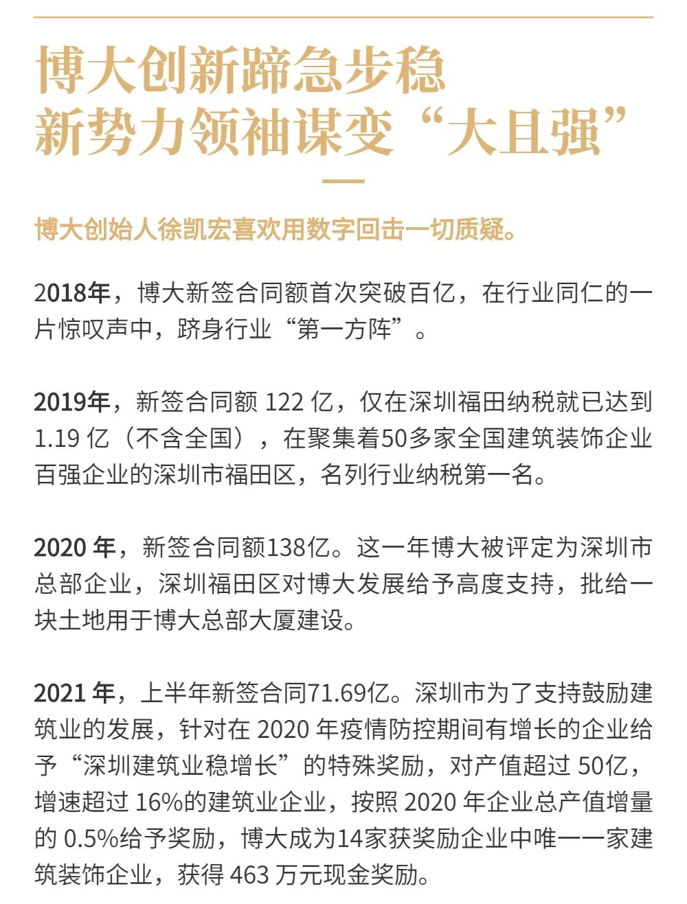 10年時間,博大業績實現了從10億到138億的高速增長,從默默無聞到行業知名,屢屢創造發展奇跡。2019年成為深圳市福田區行業排名第一的納稅大戶;2020年成為深圳市總部企業;2021年榮獲深圳市政府建筑業穩增長獎勵,成為行業唯一一家獲此殊榮的裝飾企業。